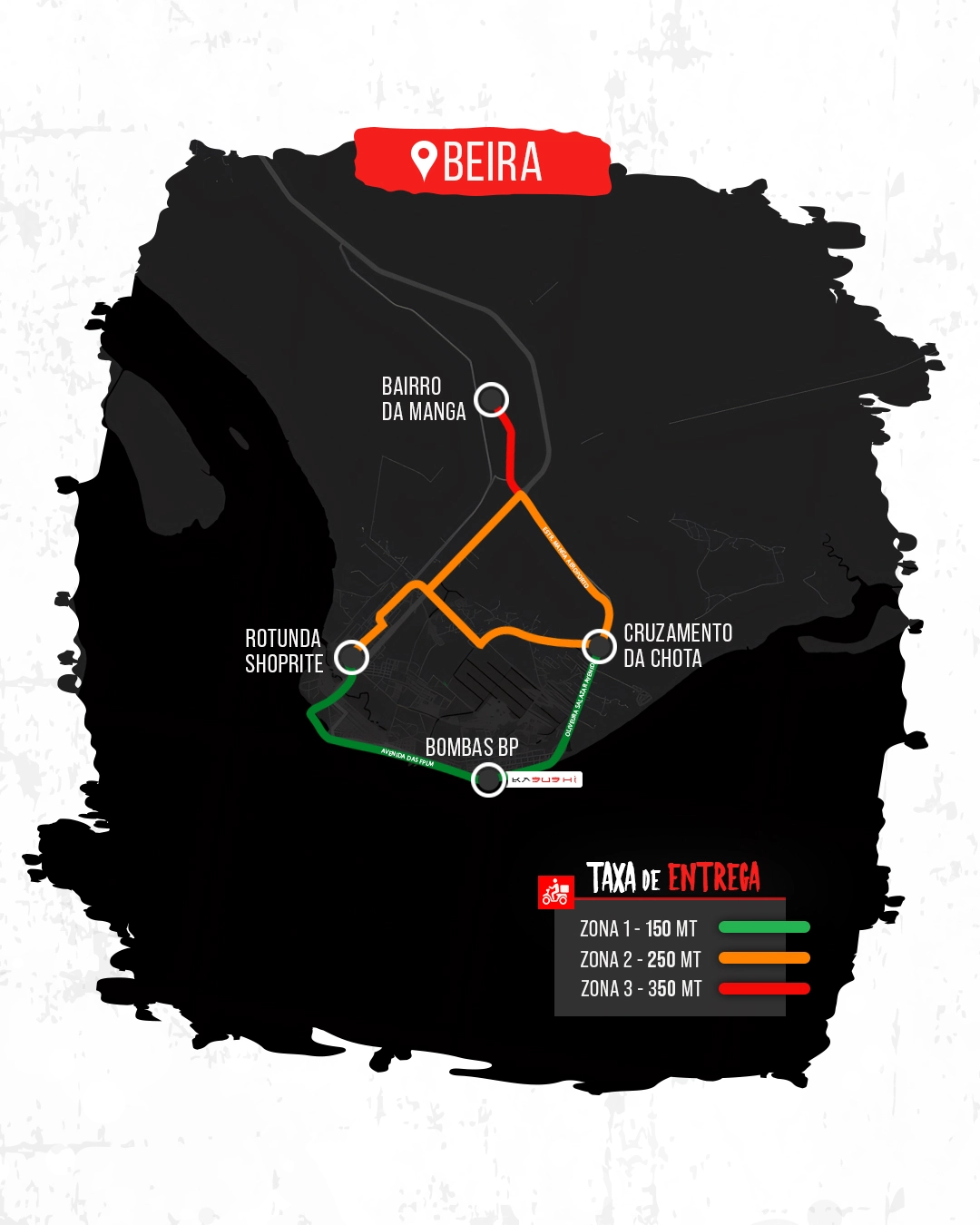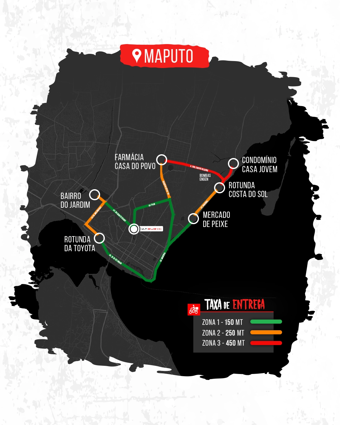 Os limites de entrega variam de acordo com a zona da cidade, com entregas disponíveis em várias áreas próximas ao restaurante. O serviço de entrega cobre distâncias específicas nas cidades da Maputo, Matola, e Beira, e pode ter restrições em zonas mais distantes ou em dias chuvosos.