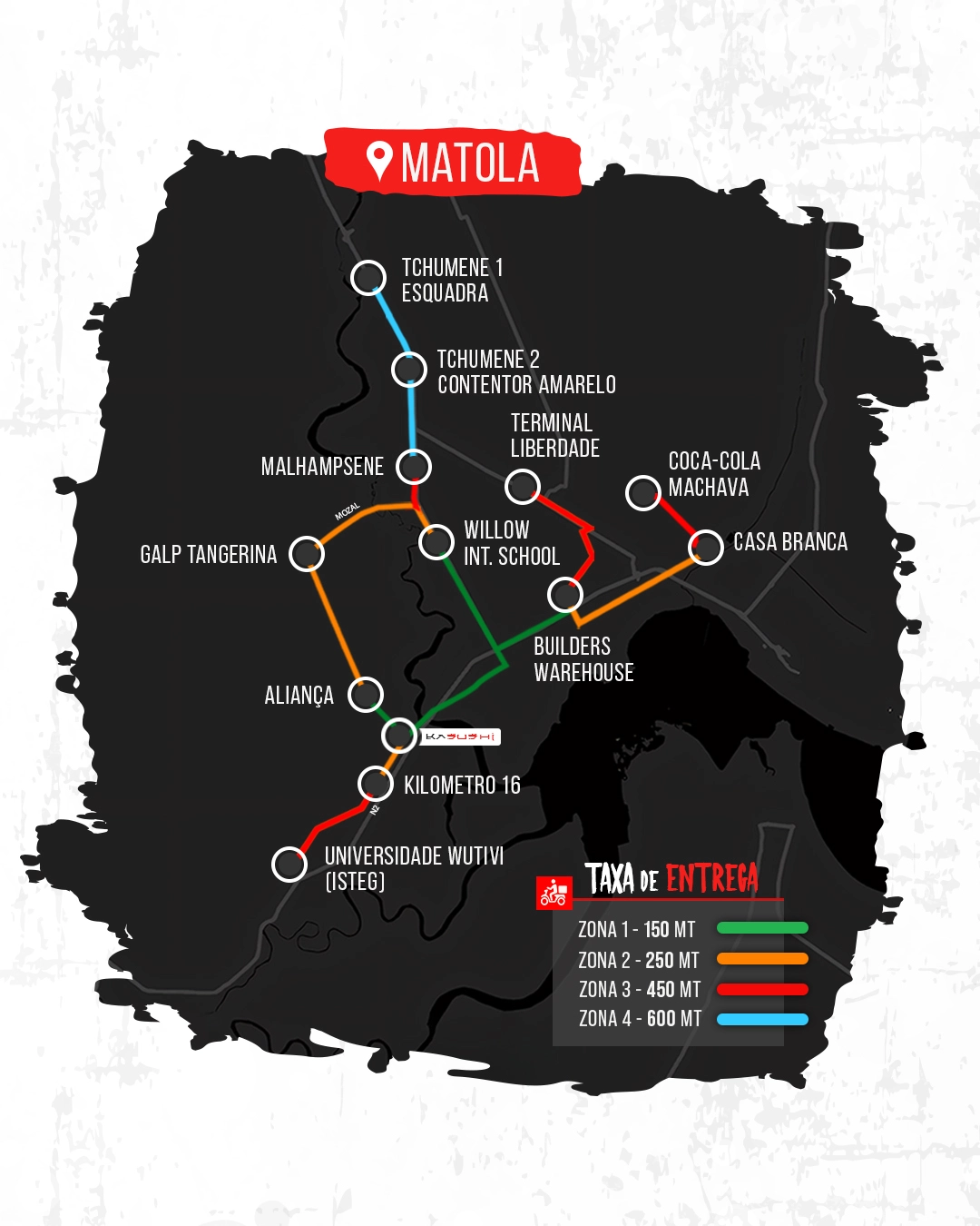 Os custos começam a partir de 150 Mt, podendo chegar até 600 Mt, dependendo da distância entre o restaurante e o destino.